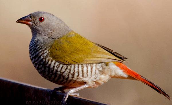 雌雄鳥(niǎo)很容易辨別,雌鳥(niǎo)頭部為純灰色,全身的毛色都比雄鳥(niǎo)黯淡。幼鳥(niǎo)腰部和尾為橙色,與成鳥(niǎo)的紅色不同。