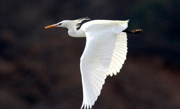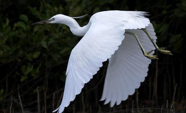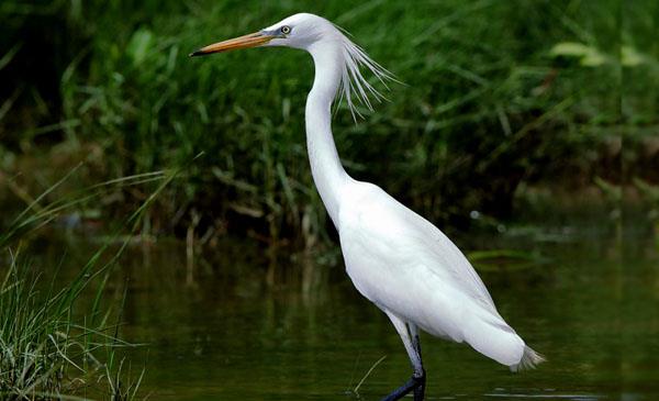 頭體長(cháng)46-65cm,重320-650g。身體纖瘦而修長(cháng),通體白色,嘴、頸、腳均很長(cháng)。繁殖季節有細長(cháng)的飾羽,后頭的冠羽長(cháng)而密,肩羽延伸至尾部但末端平直,下頸飾羽呈長(cháng)尖形,覆蓋胸部。夏季嘴橙黃色,眼先藍色,腳黑色,頭頂至枕部有多枚細長(cháng)白羽組成的叢狀羽冠。冬季嘴暗褐色,下嘴基部黃色,眼先黃綠色,腳亦黃綠色,背、肩和前頸無(wú)蓑狀長(cháng)羽。繁殖臉部裸露皮膚藍色,嘴黑色,下基部黃色,腳黃綠至藍綠色。虹膜黃色,爪黑色。