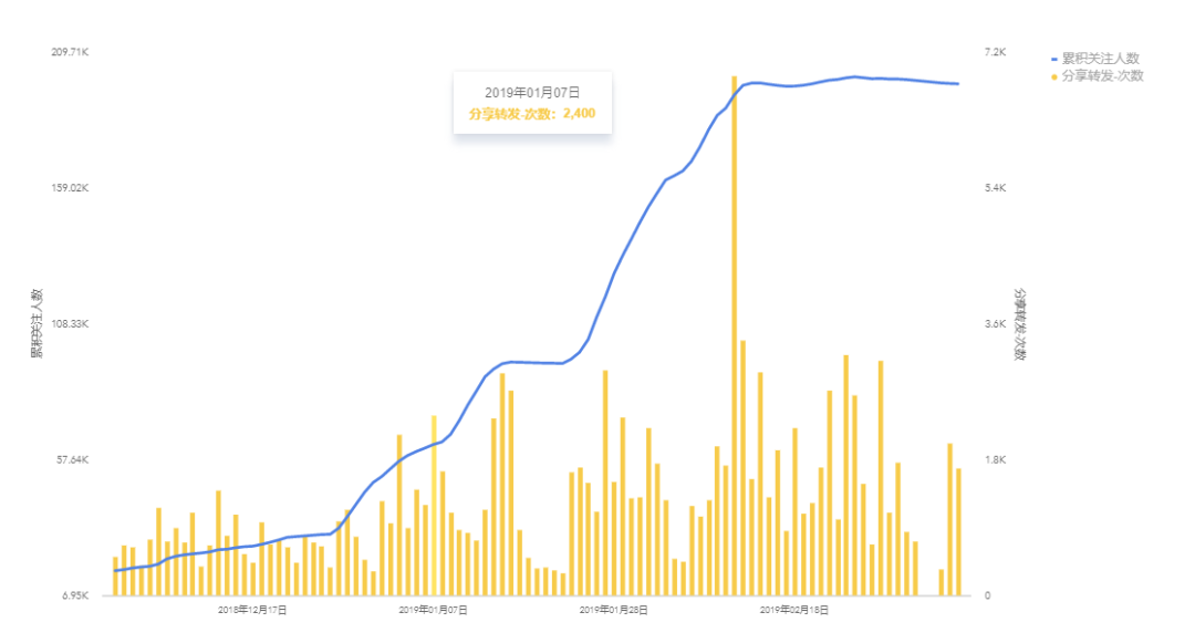 (賬號分享數據圖,柱狀圖是分享轉發(fā)次數,線(xiàn)條是累積關(guān)注人數)