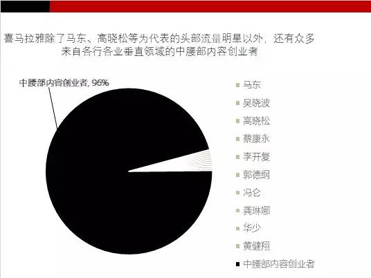平臺主播人群超過(guò)500萬(wàn),其中以馬東、郭德綱等為代表的加V認證的主播占比超過(guò)4%,數量達到20萬(wàn)人;除了馬東、高曉松等為代表的頭部流量明星以外,還有眾多來(lái)自各行各業(yè)垂直領(lǐng)域的中腰部?jì)热輨?chuàng )業(yè)者利用喜馬拉雅為自己的內容變現。