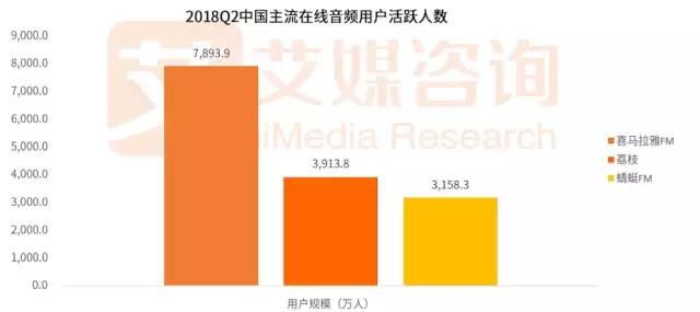 2018年Q2喜馬拉雅活躍用戶(hù)數突破7893萬(wàn),大于荔枝和蜻蜓FM的總和,可見(jiàn)喜馬拉雅的活躍用戶(hù)規模在整個(gè)在線(xiàn)音頻行業(yè)的占比最大,用戶(hù)最為活躍。