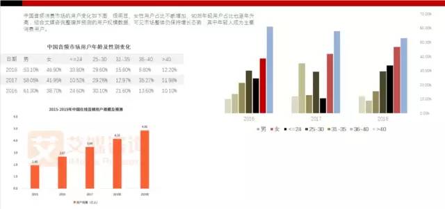 為了了解喜馬拉雅平臺的用戶(hù)特征,我先對整個(gè)音頻內容消費行業(yè)的用戶(hù)規模和性別、年齡做了統計,數據分別來(lái)自于艾媒咨詢(xún)、易觀(guān)出品的數據報告。