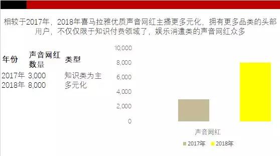 相較于2017年,2018年聲音網(wǎng)紅的增長(cháng)率達270%,平臺主要內容創(chuàng )業(yè)者的領(lǐng)域也從單一轉向多元化發(fā)展。2017年整個(gè)行業(yè)都在大談知識付費,2018年開(kāi)始轉向音頻內容消費,每條音頻背后的內容不再拘泥于可用性、實(shí)用性,也可以選擇娛樂(lè )性、消遣型的音頻創(chuàng )作。