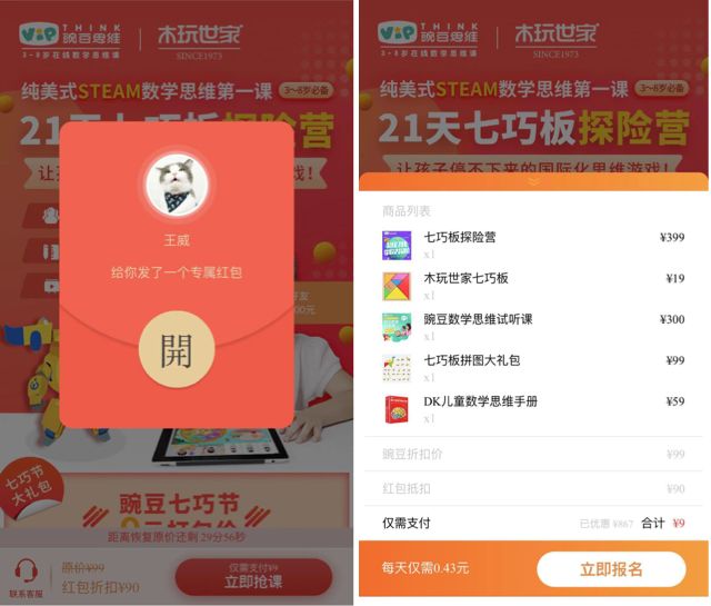 這次我們包裝的大禮包,包含21天的七巧板課程、七巧板實(shí)物包郵、七巧板拼圖大全、豌豆思維直播課、打卡還獎DK數學(xué)思維手冊。這么便宜的的價(jià)格能買(mǎi)到很多東西,每個(gè)東西單拎出來(lái)都能值9元,一共才9元,每件商品一個(gè)個(gè)展開(kāi)放,用戶(hù)就會(huì )覺(jué)得非常超值,錯過(guò)不買(mǎi)都覺(jué)得很虧,超預期的價(jià)值感知帶來(lái)超高的轉化率