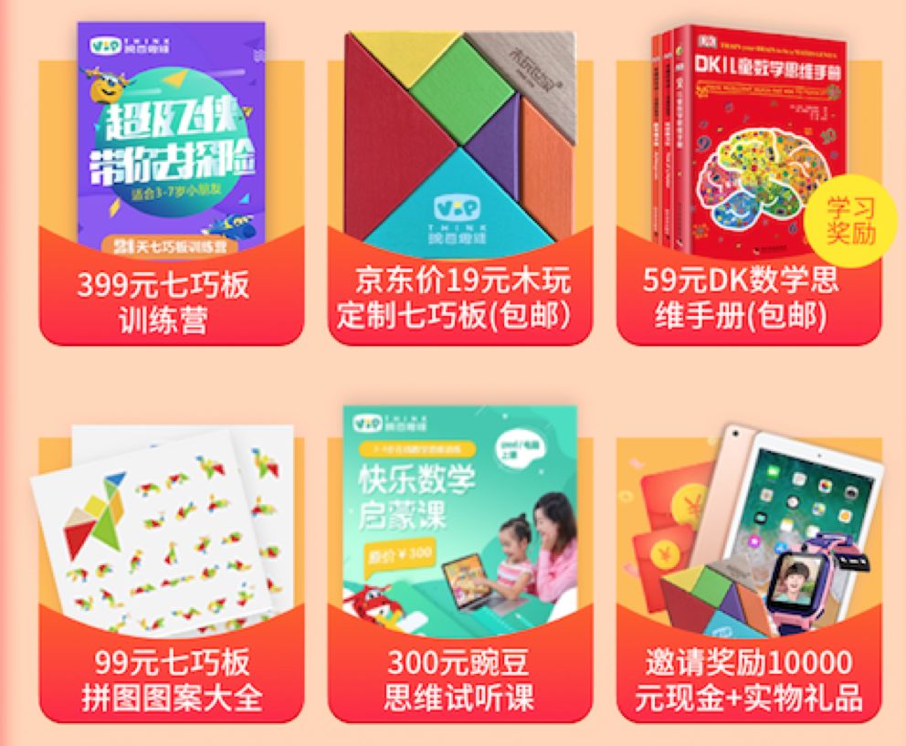 現有的21天七巧板學(xué)習課程,并聯(lián)合木玩世家定制了專(zhuān)屬的七巧板實(shí)物,針對豌豆的目標用戶(hù)群,包裝一個(gè)“課程+實(shí)物”的組合有爆款的潛質(zhì),通過(guò)設置低價(jià)課做分銷(xiāo)裂變引流,將精準目標用戶(hù)圈到自有平臺,后面轉化高客單價(jià)的模式,能實(shí)現低成本營(yíng)收增長(cháng)。
