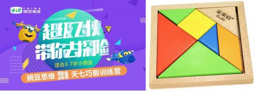 七巧板探險營(yíng)的主題,受眾人群廣,簡(jiǎn)單輕松好玩,很多家庭給孩子買(mǎi)了七巧板,但沒(méi)有玩起來(lái),大家都只是聽(tīng)說(shuō)能拼成1600個(gè)圖案,怎么拼沒(méi)人教不會(huì )玩。很少有專(zhuān)門(mén)講七巧板的系列課程,市場(chǎng)較為空白,產(chǎn)品剛好滿(mǎn)足這部分市場(chǎng)需求。