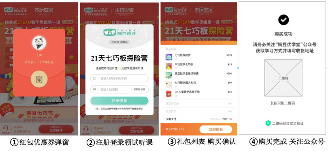 包裝的大禮包中,包含21天的七巧板課程、七巧板實(shí)物包郵、七巧板拼圖大全、豌豆思維直播課、打卡還獎DK數學(xué)思維手冊。這么便宜的的價(jià)格能買(mǎi)到很多東西,每個(gè)東西單拎出來(lái)都能值9元,而課程一共才9元,每件商品一個(gè)個(gè)展開(kāi)放,用戶(hù)就會(huì )覺(jué)得非常超值,錯過(guò)不買(mǎi)都覺(jué)得很虧,超預期的價(jià)值感知帶來(lái)超高的轉化率。