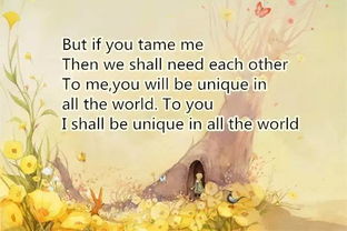 但是,如果你馴服了我,我們就互相不可缺少了。對我來(lái)說(shuō),你就是世界上唯一的了;我對你來(lái)說(shuō),也是世界上唯一的了。