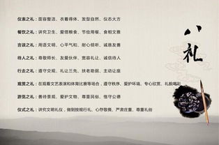 二、內涵:八禮:儀表之禮,包括面容整潔、衣著(zhù)得體、發(fā)型自然、儀態(tài)大方。餐飲之禮,包括講究衛生、愛(ài)惜糧食、節儉用餐、食相文雅。
