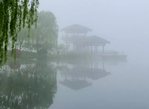 鏡未磨:古人的鏡子用銅制作、磨成。這里一說(shuō)是水面無(wú)風(fēng) ,波平如鏡;一說(shuō)是遠望湖中的景物,隱約不清,如同鏡面沒(méi)打磨時(shí)照物不清楚。