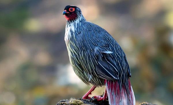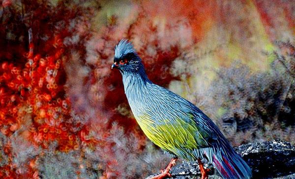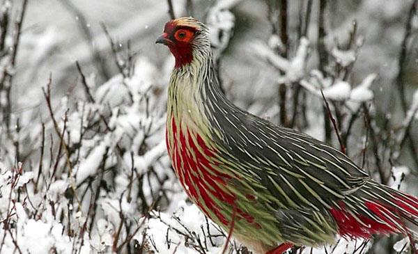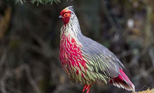 血雉:別名血雞_藪雞_綠雞_柳雞_松花雞_太白雞_松雞子_紅腳雞,為雞形目、雉科、血雉屬鳥(niǎo)類(lèi),原產(chǎn)于亞洲西南部,喜馬拉雅山脈地區,包括中國(西藏、青海、甘肅、四川、云南)、尼泊爾、錫金、緬甸。野生于海拔1700-4500m,高寒山地森林及灌叢。1821年命名,共12個(gè)亞種。有明顯的季節性垂直遷徙,常出沒(méi)于白樺、紅樺、山楊、山柳、冷杉和箭竹林地。雄鳥(niǎo)叫聲為短促的Si叫聲,報警時(shí)咯咯地叫,有時(shí)發(fā)出Si-Si-Si哨音。雄和雌鳥(niǎo)均會(huì )發(fā)出鳶一般的Chiu-Chiu尖叫,以召集分散的鳥(niǎo)群。我國2級重點(diǎn)保護野生動(dòng)物。