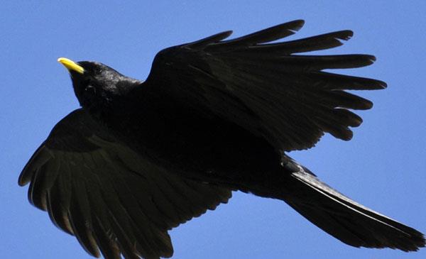 黃嘴山鴉:別名短嘴山鴉_亞洲黃嘴山鴉,為雀形目、鴉科、山鴉屬鳥(niǎo)類(lèi),原產(chǎn)于亞洲中部、歐洲南部,熱帶、亞熱帶高原地區。我國內蒙古、新疆、甘肅、青海、四川、西藏有分布。野生于海拔3000-6000m的高山灌叢、草地、荒漠等開(kāi)闊地帶,冬季會(huì )下降到海拔2000m左右的中山和山腳地帶。1766年命名,共3個(gè)亞種。叫聲嘈雜,似甜美淌水般的Preeeep聲,及降調的哨音Sweeeoo,比紅嘴山鴉叫聲尖厲。告警時(shí)發(fā)出卷舌的Churrr聲,進(jìn)食時(shí)發(fā)出恬靜的吱吱鳴囀。