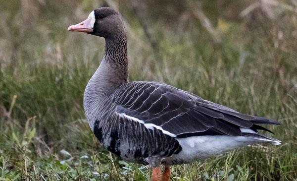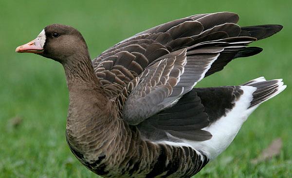 體長(cháng)64-80cm,重2.1-3.5kg。額和上嘴基部具一白色寬闊帶斑,白斑后緣黑色。頭頂和后頸暗褐色,背、肩、腰暗灰褐色,具淡色羽緣。翅上覆羽和三級飛羽亦為暗灰褐色。尾羽黑褐色,具白色端斑。尾上覆羽白色,頦暗褐色、其前端具一細小白斑,前頸、頭側和上胸灰褐色,向后逐漸變淡。腹污白色,雜有不規則的黑色斑塊,兩脅灰褐色,尾下覆羽白色。虹膜褐色,嘴肉色或粉紅色,腳橄欖黃色。