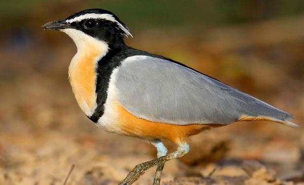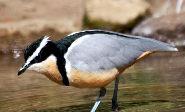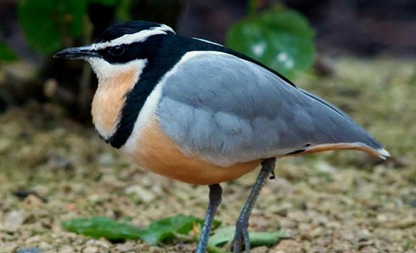 體長(cháng)20-26cm,翼展47-51cm,重80-92g。體羽主要是黑、白、灰、淺黃4種顏色的羽毛組成,特別醒目。頭部有白色寬帶,眼睛有一塊面積很大的黑三角,翅膀灰藍色,多數上體灰藍色,有黑色胸帶,喉、頸、胸、腹和下體的其余部分是白色或橙色。飛行中,可以看到明亮的白色的翅膀,黑色寬帶為一體接近邊界處逐漸減退并從中間穿過(guò)。尾羽被厚厚的白色羽毛。眼先被羽,嘴細而直,較短。頸和腳均較長(cháng),趾間蹼不發(fā)達。