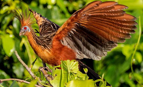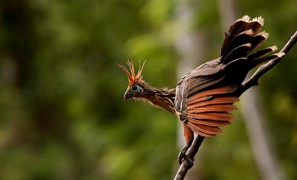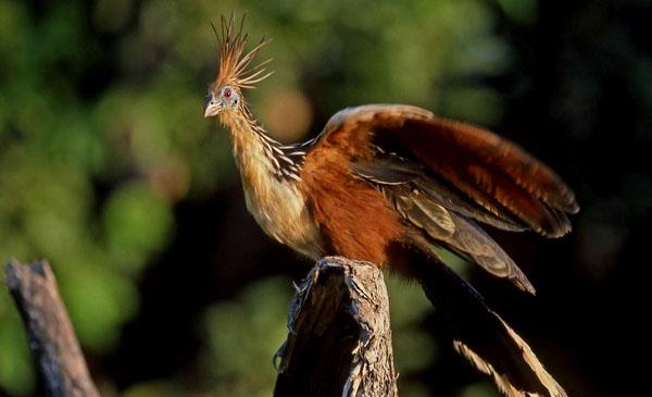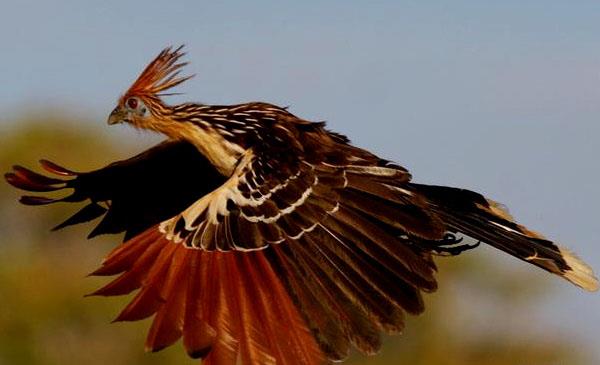 麝雉:別名爪羽雞,為鵑形目、麝雉科、麝雉屬鳥(niǎo)類(lèi),原產(chǎn)于南美洲中部及北部,包括玻利維亞、巴西、哥倫比亞、厄瓜多爾、圭亞那等國。棲息于亞馬遜河流域的水淹森林、洪澇雨林,不善于飛行卻擅長(cháng)游泳,所以常常在水面上方的樹(shù)枝上筑巢活動(dòng)以便及時(shí)泅水逃咶生、躲避敵害。1776年命名,無(wú)亞種。