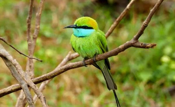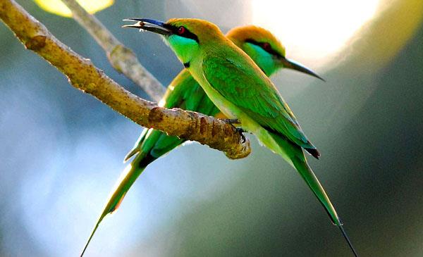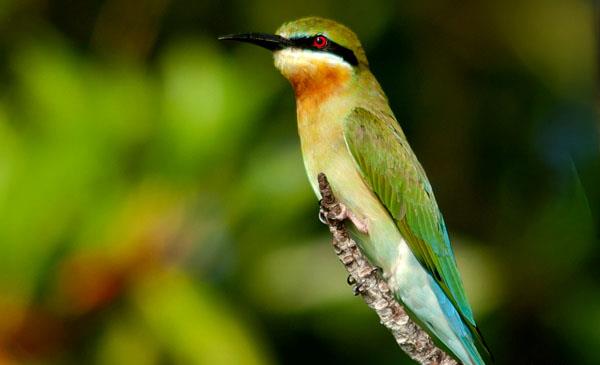 綠喉蜂虎鳥(niǎo):別名綠喉蜂虎,為佛法僧目、蜂虎科、蜂虎屬鳥(niǎo)類(lèi),原產(chǎn)于亞洲、非洲的熱帶及亞熱帶地區,我國分布于云南西南部、中部和南部。野生于林緣疏林、竹林、稀樹(shù)草坡等開(kāi)闊地區,也出現于城鎮公園和果園,耕地旁山坡的竹林枝椏上、疏林的禿枝上、電線(xiàn)上甚至地面上、耕牛背上。1802年命名,共9個(gè)亞種。見(jiàn)到飛蟲(chóng)飛過(guò),即敏捷地在空中捕捉。捕獲獵物后,習慣先將獵獲物與硬物撞擊后吞食。