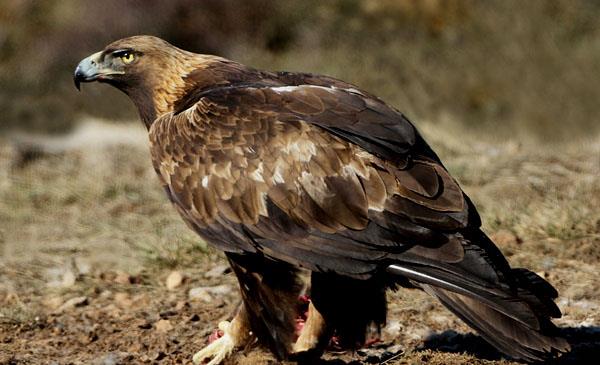 經(jīng)過(guò)訓練的金雕,可以在草原上長(cháng)距離地追逐狼,等狼疲憊不堪時(shí),一爪抓住其脖頸,一爪抓住其眼睛,使狼喪失反抗的能力,曾經(jīng)有過(guò)一只金雕先后抓狼14只的記錄。相比之下,它的運載能力較差,負重能力還不到1kg。在捕到較大的獵物時(shí),就在地面上將其肢解食用,分批帶回棲宿的地方。它捕食的獵物有數十種之多,如雁鴨類(lèi)、雉雞類(lèi)、松鼠、狍子、鹿、山羊、狐貍、旱獺、野兔等等,有時(shí)也吃鼠類(lèi)等小型獸類(lèi)。