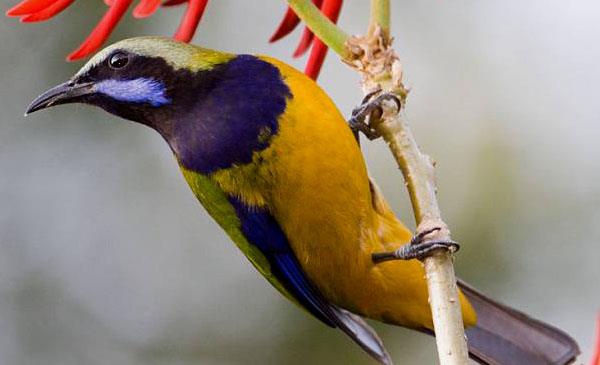 頭體長(cháng)16-21cm,重21-40g。翅上小覆羽亮藍色,其余翅上覆羽和初級飛羽紫黑色,外翈為深藍色具金屬光澤,次級飛羽外翈綠色。尾羽暗褐至黑色,大多沾有暗紫色或暗藍色。額基、眼先、頰、耳羽和耳羽下方均為藍黑色且與頦、喉和上胸黑色連為一體。眉區和眼后微沾黃,頦、喉和上胸微綴紫藍色,其余下體橙色,兩肋綠色。虹膜紅色、棕色至紅棕色,嘴黑色,跗蹠灰綠色、鉛灰色至黑色。