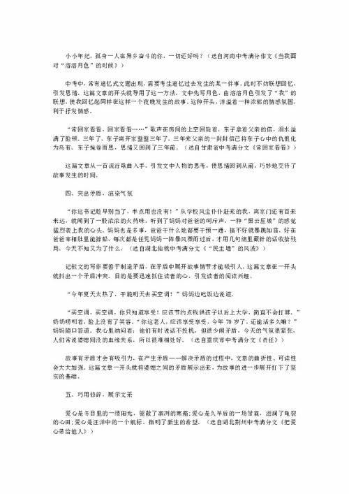 開(kāi)頭和結尾應試作文的開(kāi)頭結尾,就是文章的刀刃。平時(shí)在課內外所學(xué)的各種開(kāi)頭結尾的方法完全可以用在應試作文上。不管你使用什么方法開(kāi)頭和結尾,必須做到開(kāi)頭起筆入題,結尾點(diǎn)明主旨。為了給評卷老師一個(gè)好的印象,開(kāi)頭結尾千萬(wàn)不要涂抹。有道是:良好的開(kāi)端是成功的一半??捎行┛忌浮叭腩}慢”的毛?。河械陌汛蠖蔚脑牧先空瞻?;有的把本來(lái)簡(jiǎn)潔的原材料進(jìn)行擴展;有的開(kāi)篇擺材料,古今中外,慢慢道來(lái)。開(kāi)篇松散,占去了大量的篇幅,后面的真轉載自百分網(wǎng)