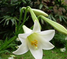 如麝香百合,又名鐵炮,花期6—7月,株高75—90厘米,葉短而厚實(shí),每株花蕾3—4朵,花色乳白色,喇叭形,花朵多,價(jià)格亦高。麝香百合喜涼爽潮濕環(huán)境,日光充足的地方、略蔭蔽的環(huán)境對百合更為適合。