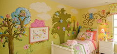 (3)兒童房使用墻繪,俏皮可愛(ài)集于一身,動(dòng)畫(huà)片中的各類(lèi)動(dòng)物,是兒童房手繪壁畫(huà)的主角。選作畫(huà)墻面約4-8平米,占墻面三分之二。