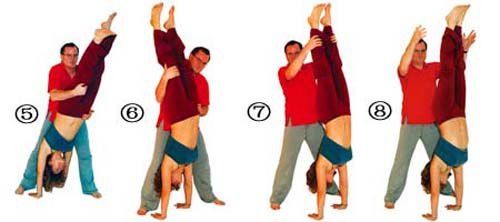 4.保護與幫助方法:保幫者站在練習者的側面,兩手握其小腿踝部向上提拉。如倒立姿勢不正確,身體不能充分伸展,可用膝蓋頂其背部,使其充分伸直。